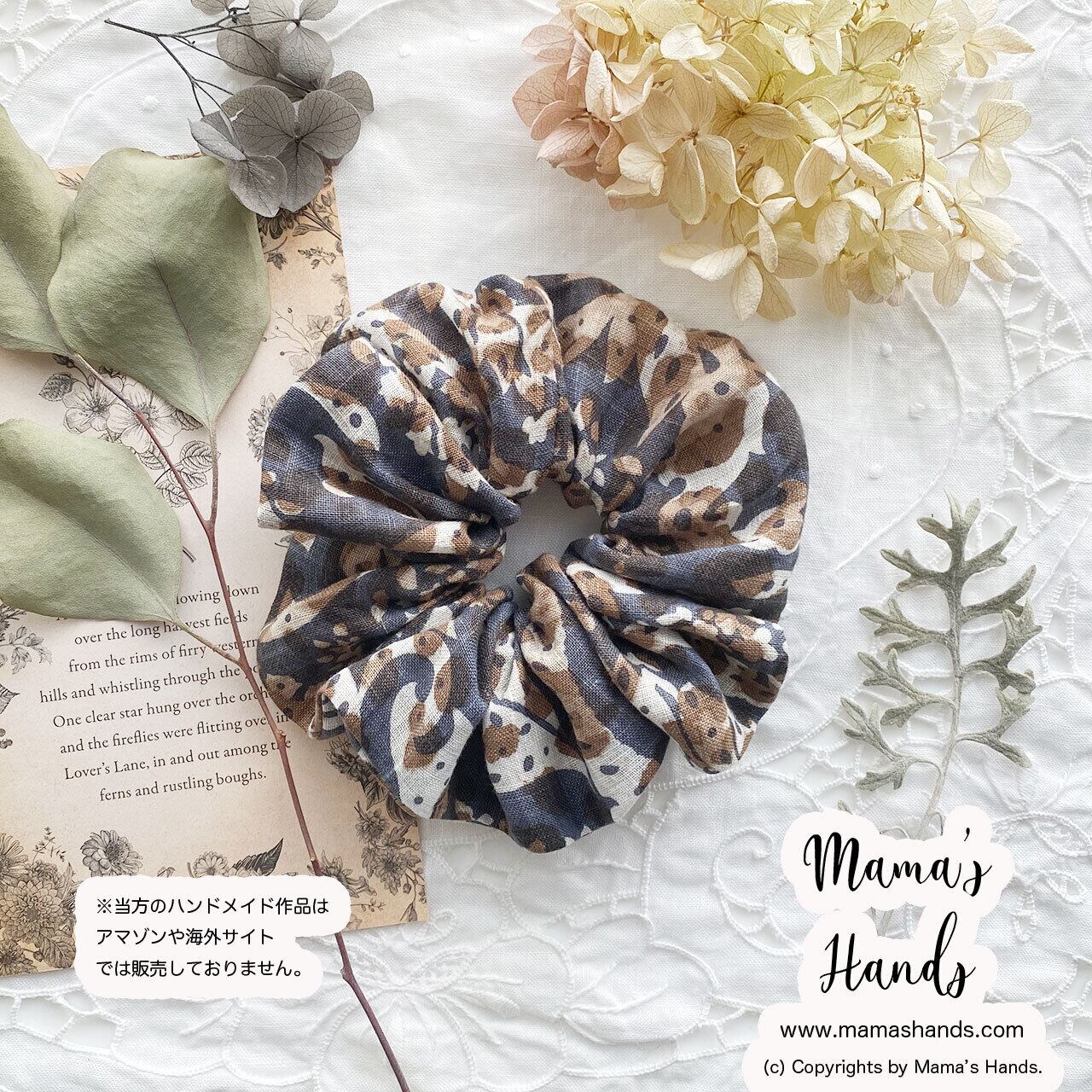 《イタリア製 リネン》 おしゃれな ペイズリー 紺 x 茶色 ナチュラル 花柄 シュシュ ヘアゴム
