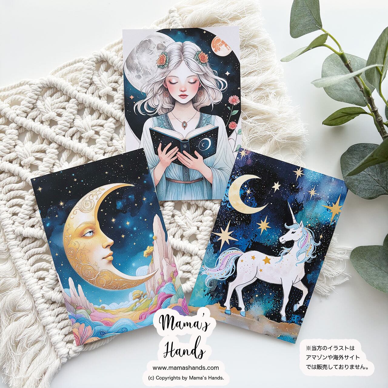 《タロットのような幻想世界》ムーンフェイス/ ユニコーン / 女性 ムーン オラクル ポストカード 3枚ハガキ セットです♪
