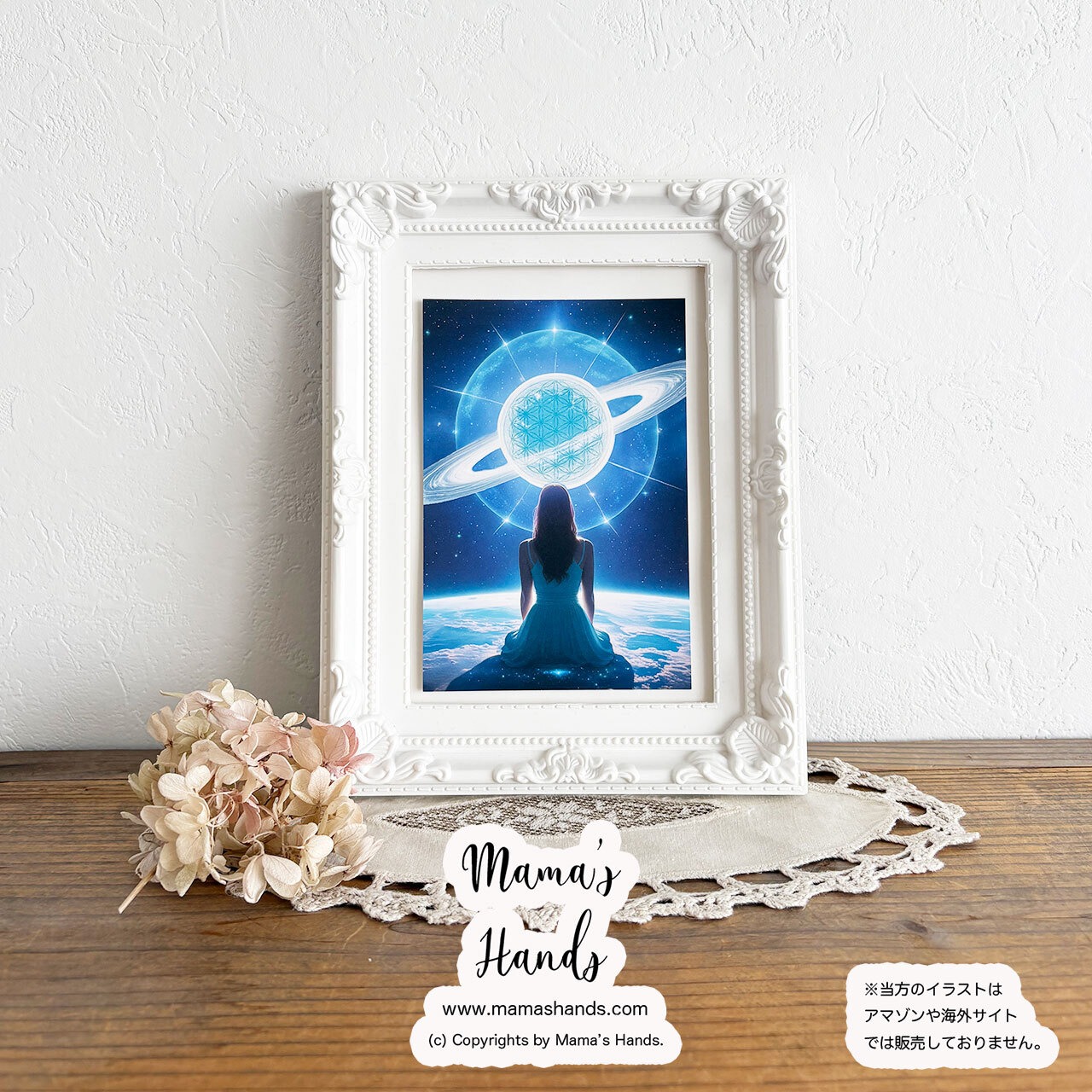 ⭐️土星と女性、シードオブライフのお守りとレムリア瞑想、プレアデス星人の絵柄です。