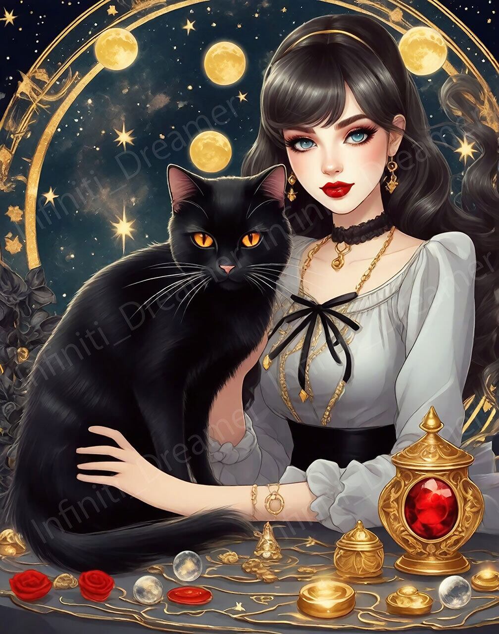 黒猫と美しい女性 のイラスト アート(デジタルコンテンツ ダウンロード販売)