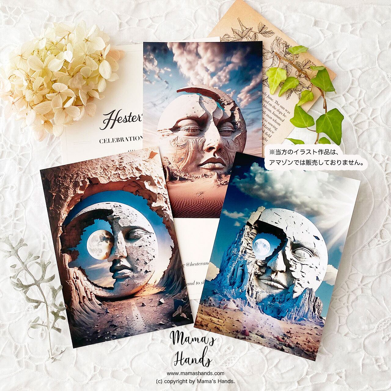 ムーンフェイス 月 宇宙 想像 古代 絵画風 イラスト アート 3枚 ハガキ ポストカード セット ♪