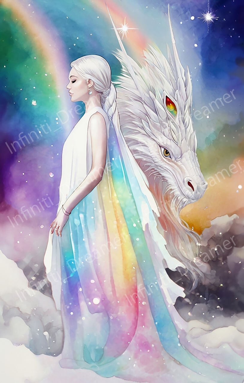 タロットカード風 女性&白龍 水彩画 パステル 龍神 龍 のスピリチュアル 開運 イラスト アート(デジタルコンテンツ ダウンロード販売)