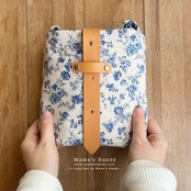 小花 生成りネイビー 紺色の綿麻生地を使用。芯つき2枚仕立ての軽い大きめバックです。ヌメ革とギボシが付いているので、バックに入れる物の大きさによって、3段階で留められます。