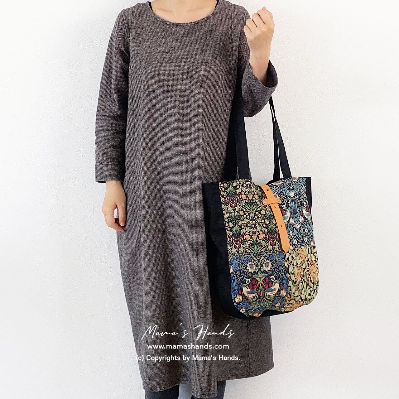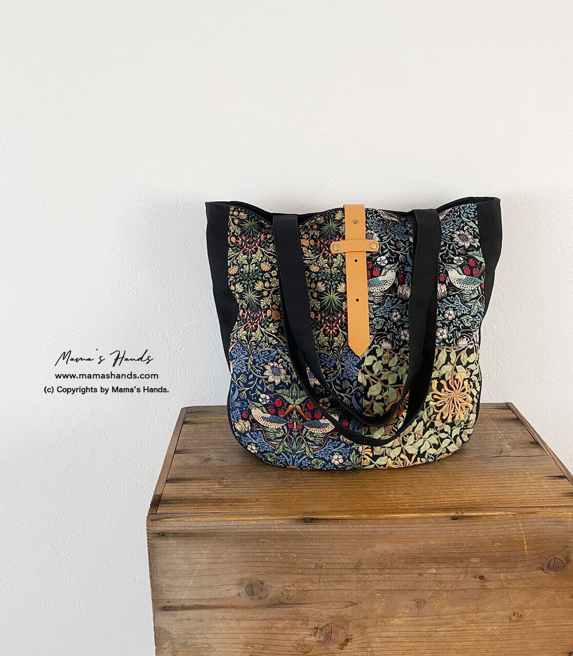 ウィリアムモリス シック系 パッチワーク ブラック 黒 ピンパーネル いちご泥棒 春 ヌメ革 (中) 軽い トートバック