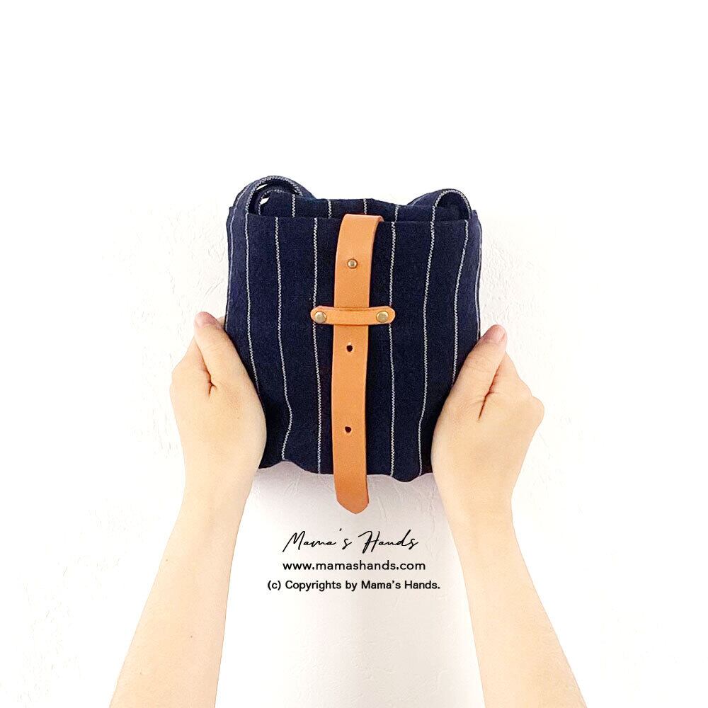 厚めのリネン生地を使用。2枚仕立ての軽い大きめバックです。ヌメ革とギボシが付いているので、バックに入れる物の大きさによって、3段階で留められます。