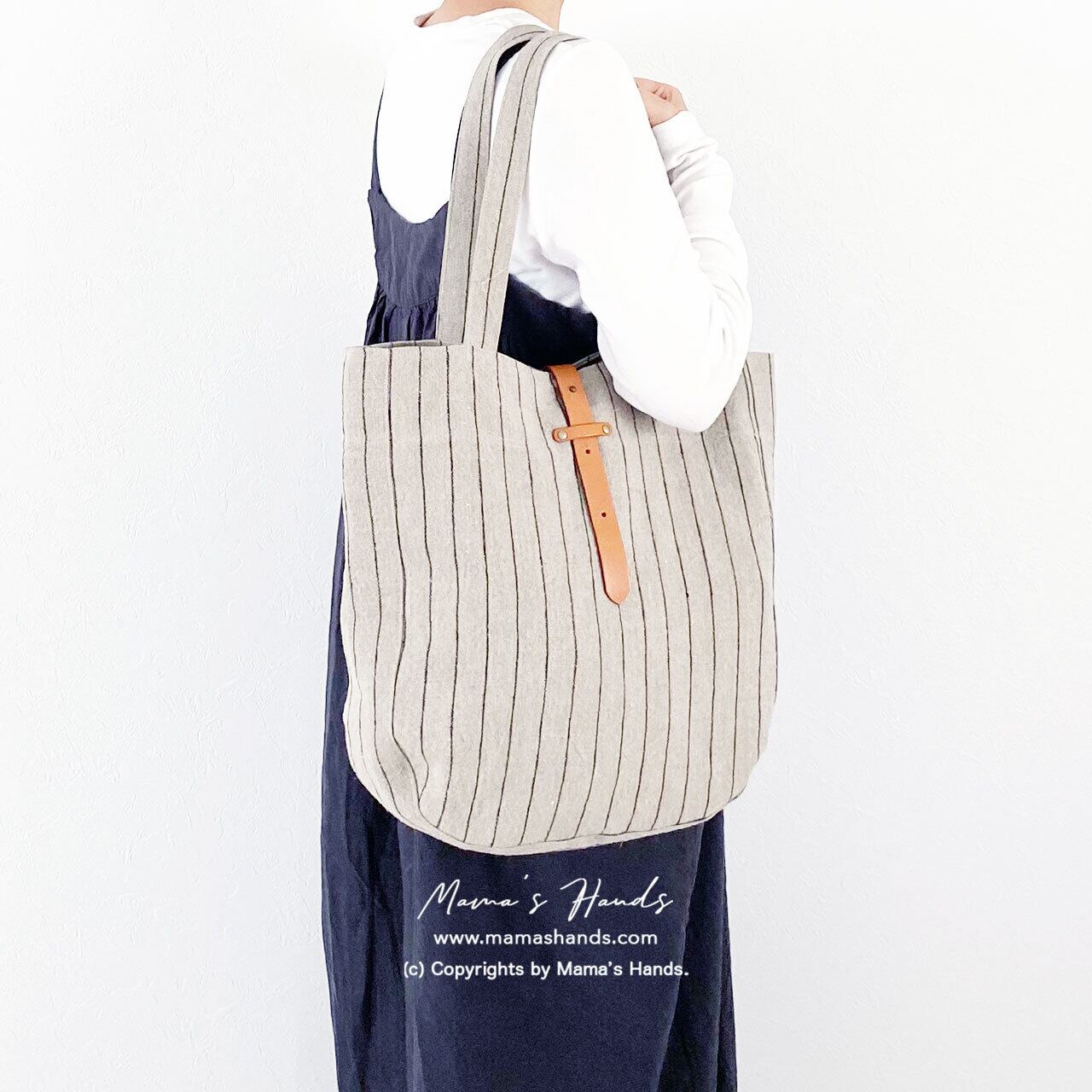 リネン ストライプ ベージュ ナチュラル ヌメ革 (中) トートバック