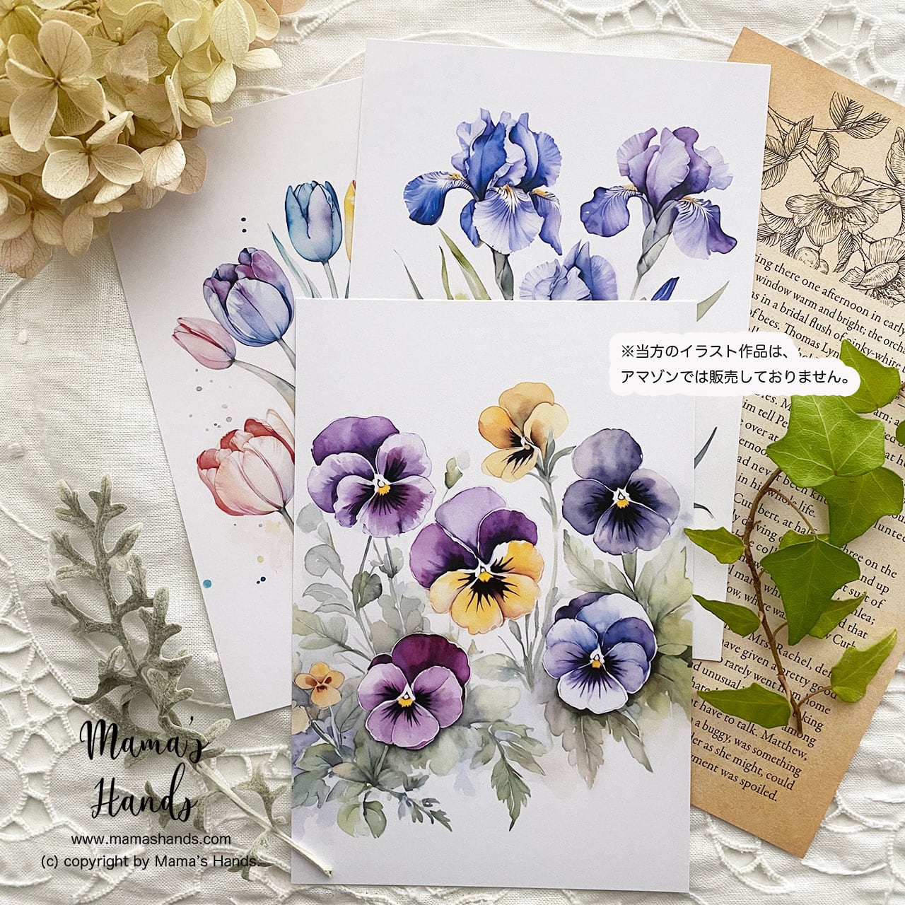 パンジー イラスト, チューリップ ポストカード, 春 ポストカード, 春 ハガキ, 寒中見舞い, 余寒見舞い, 暑中見舞い, 残暑見舞い, 引越し, 転居, 水彩画 アート, 水彩画イラスト, あやめ イラスト, チューリップ イラスト, イラストアート, mamashands