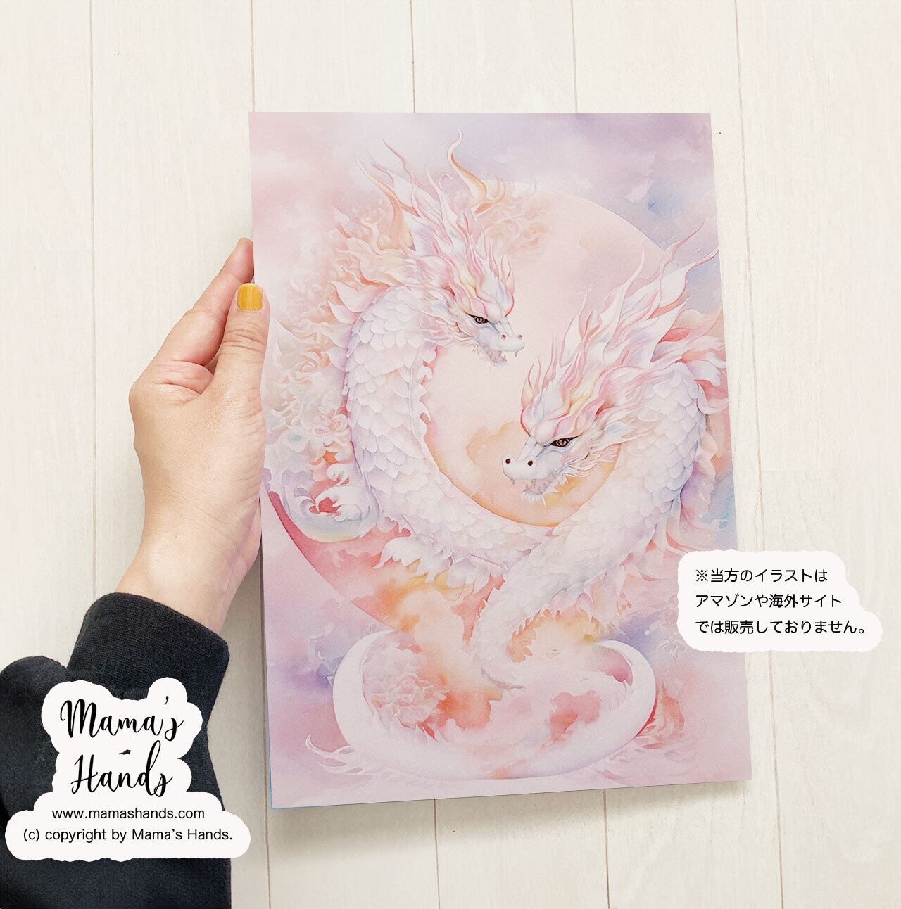 A4 ポスター ハート 龍 龍神 エネルギー パステル ピンク 水彩画 開運 イラスト アート