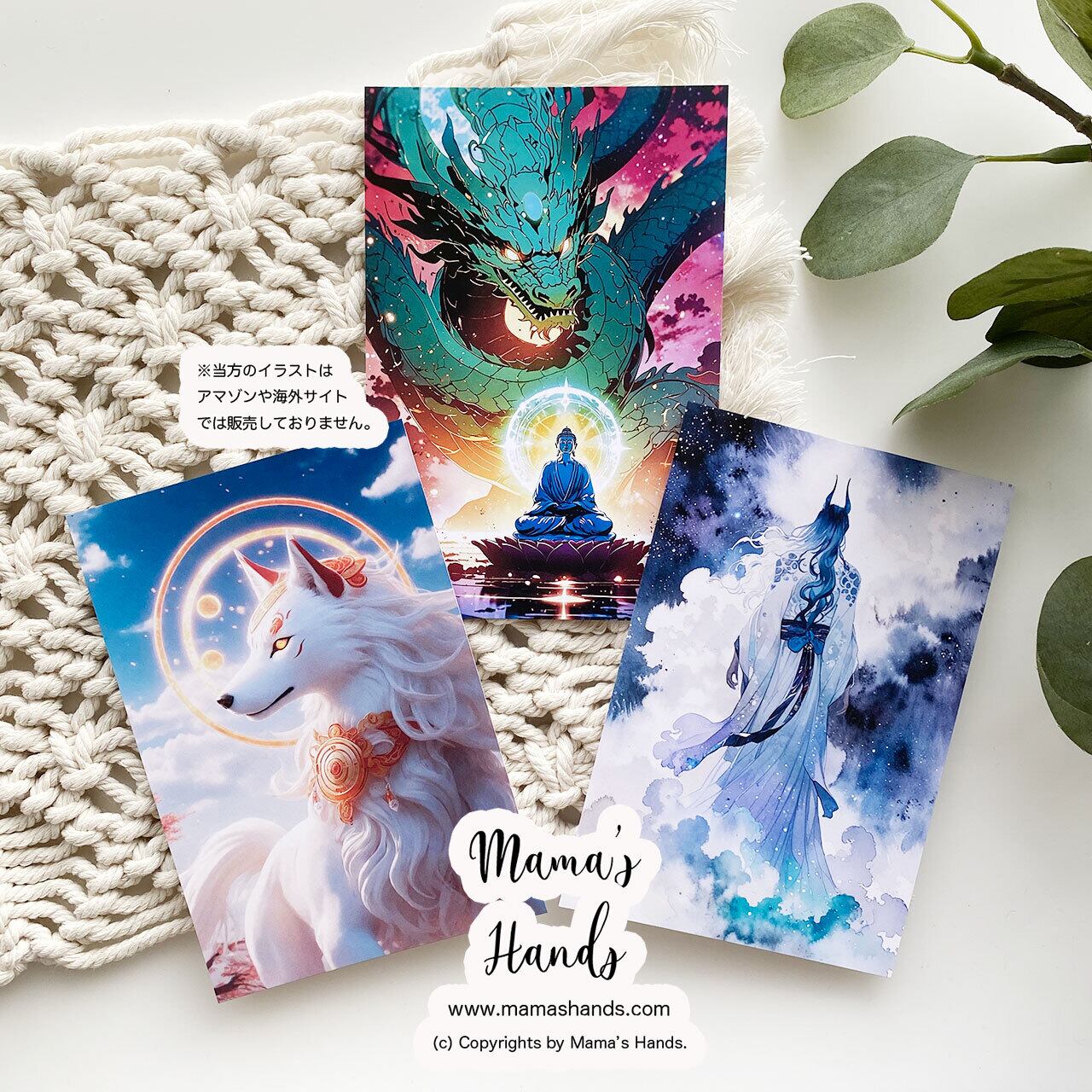 狛犬 釈迦 龍 アメノミナカヌシ 龍神 ブッダ 開運 イラスト アート 3枚 ハガキ ポストカード セット